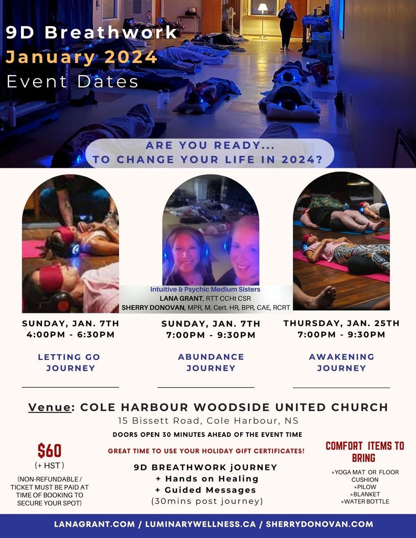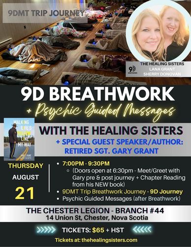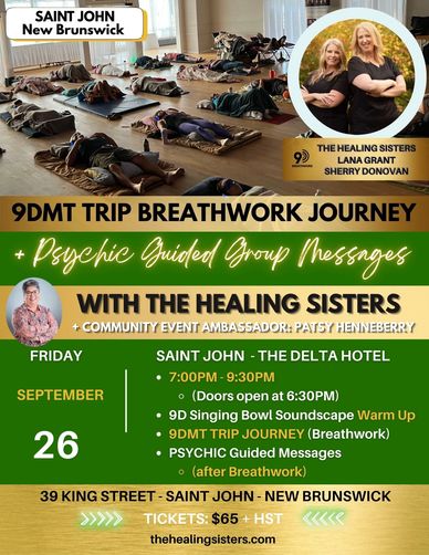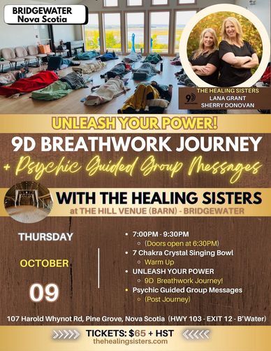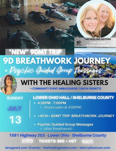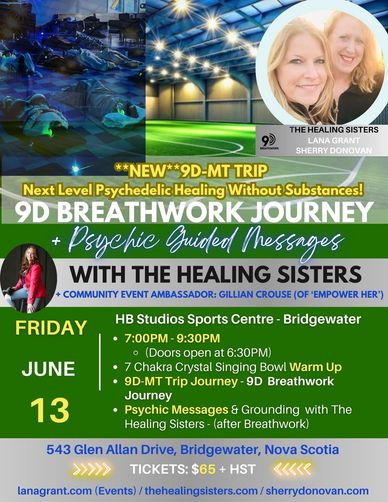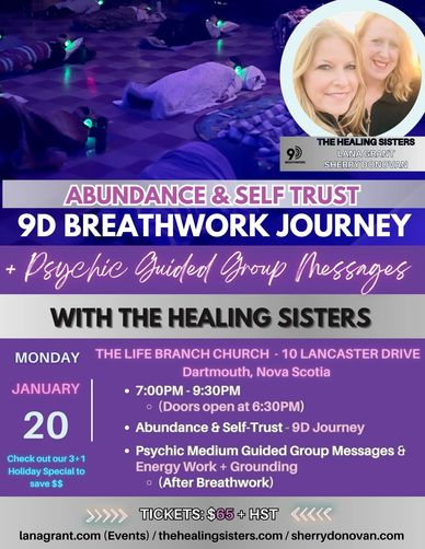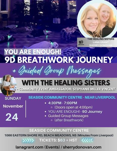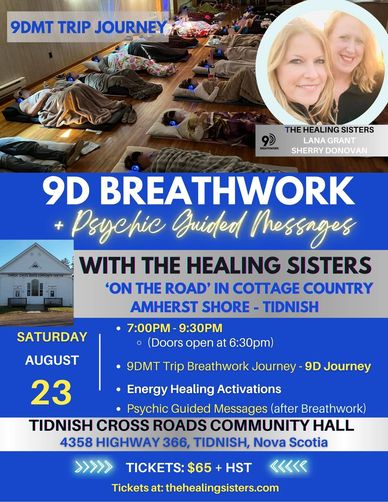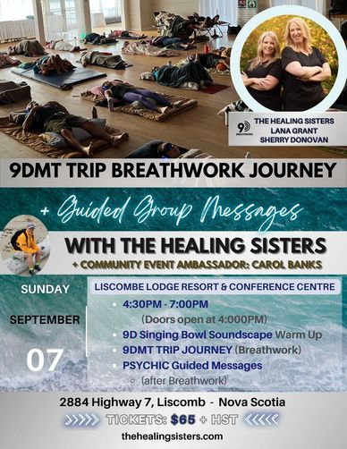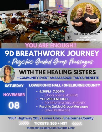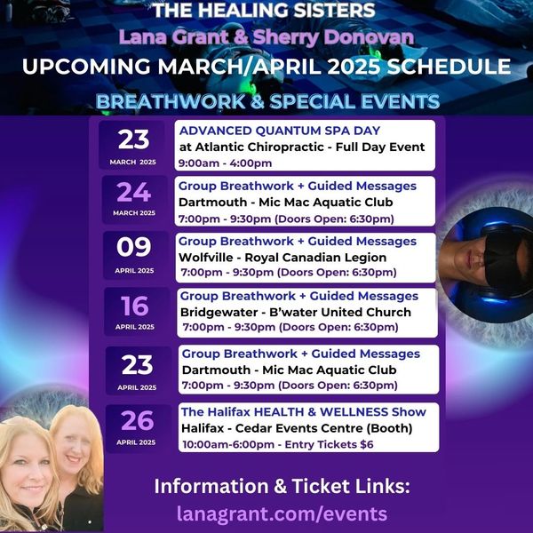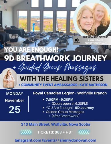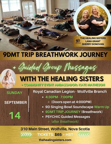 3. Wednesday, April 9/2025 - WOLFVILLE - GROUP BREATHWORK + PSYCHIC GUIDED MESSAGES EVENT with THE HEALING SISTERS at the Wolfville Legion from 7-9:30pm (doors open at 6:30pm)